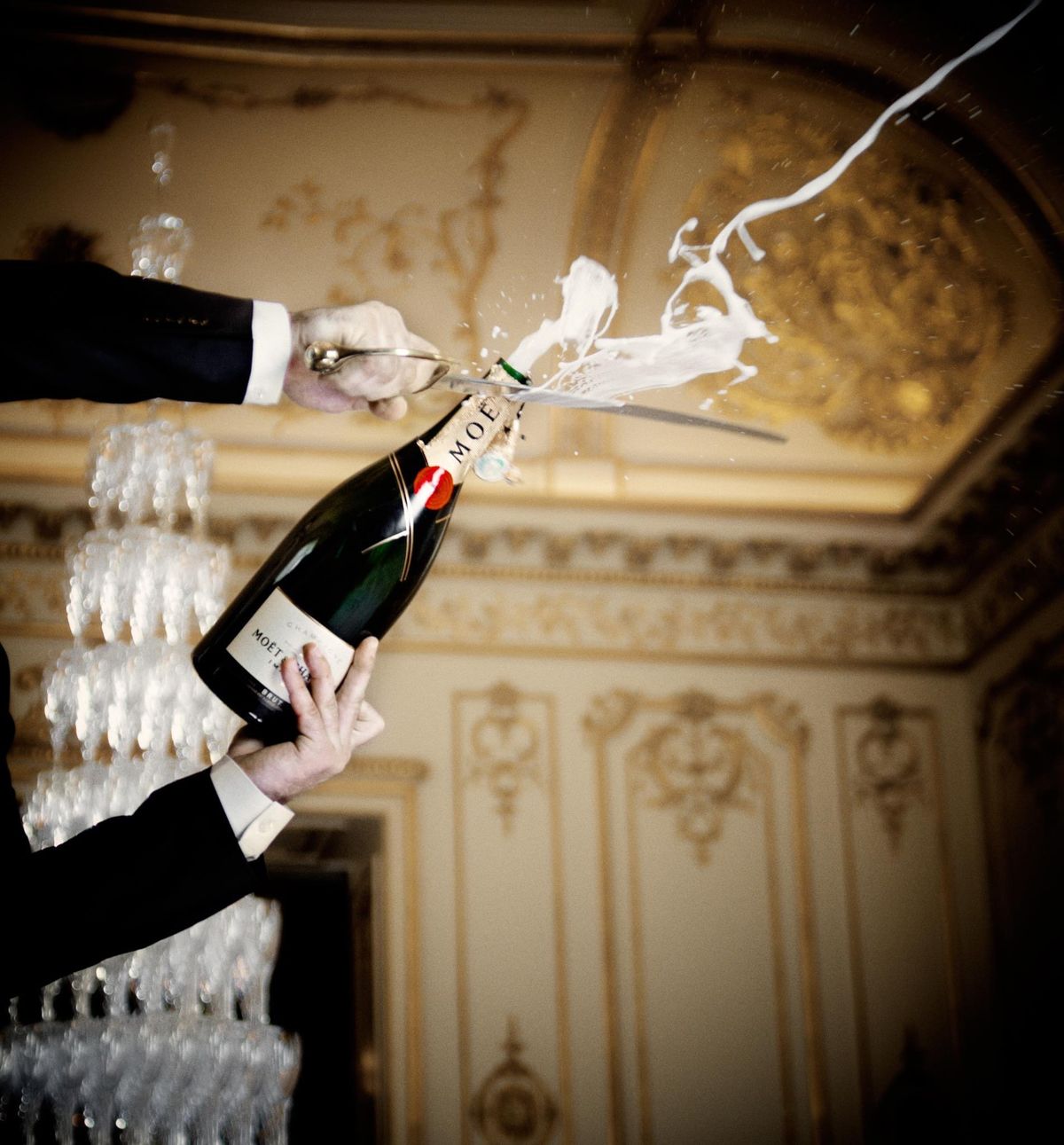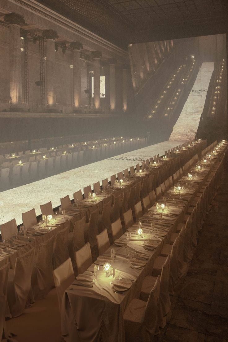 - Огромная зеркальная поверхность под углом. Она отражает происходящее вокруг: гостей, свет, сервировку, создавая эффект бесконечного пространства. Благодаря этому зал выглядит масштабно и магически.